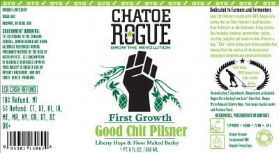 Good Chit Pilsner is made with Rogue Farm barley that we Floor-Malted in small batches. Floor Malting is an, old fashioned, 8 day process that includes steeping, germination, raking, roasting, bagging and hands on love 24 hours a day. “Chit” refers to the start of the rootlets that emerge from the embryo of the kernel once steeping is complete and germination begins.